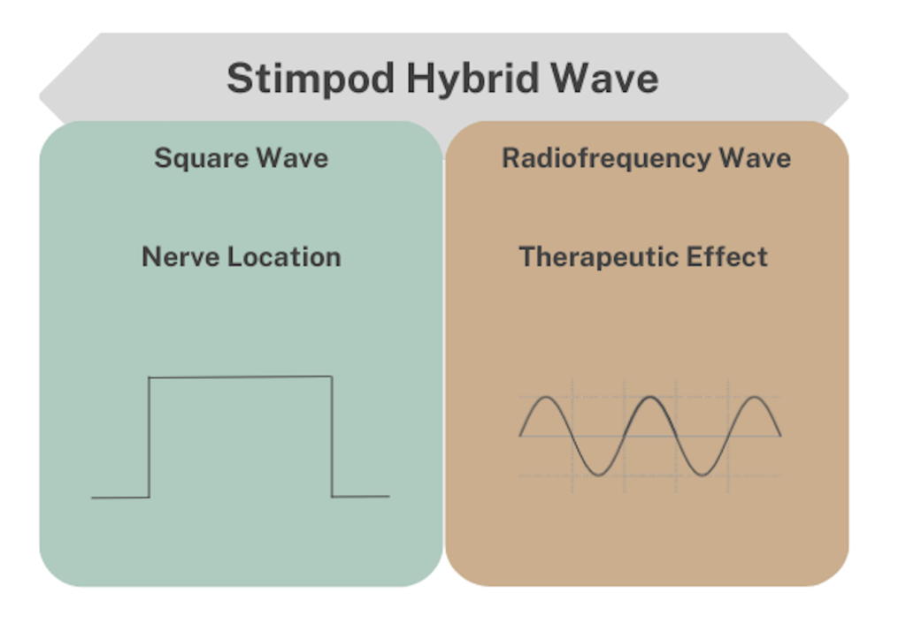 The Stimpod NMS460 uses a proprietary hybrid radiofrequency stimulating waveform. The hybrid wave takes advantage of both components (the square wave and the high-frequency) and their two distinct modes of action.
